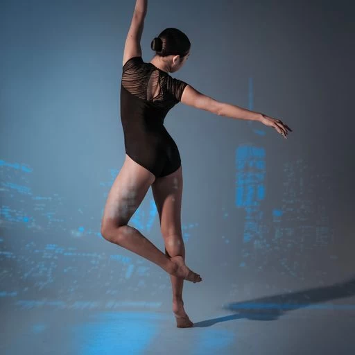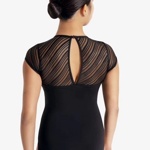 The new Paris short sleeved leotard is the height of fashion with the lined patterned mesh sleeves and upper back. The high neck comes with a back closure hook and a ballet leg line.Â