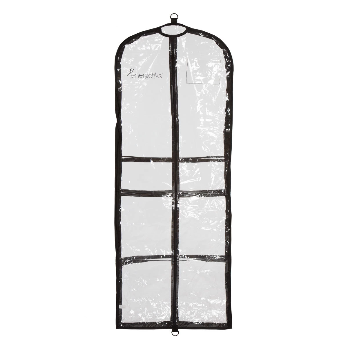 Prepare for your next competition in style with our specially designed Clear Garment Bag with classic black trim. Durable, wipe-clean and lightweight, the transparent material lets you see and identify your costumes at a glance, whilst the handy zip pockets store all your accessories, tights and more in easy reach with 2 small pockets and 4 medium/large pockets. A must-have for any dancer on the go. Dimensions: 50 cm (L) x 130 cm (H) x 5 cm (D)