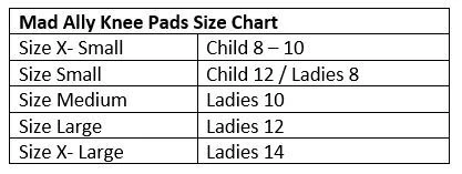 These Mad Ally Knee Pads are available in 5 sizes X- Small, Small, Medium, Large & X- Large