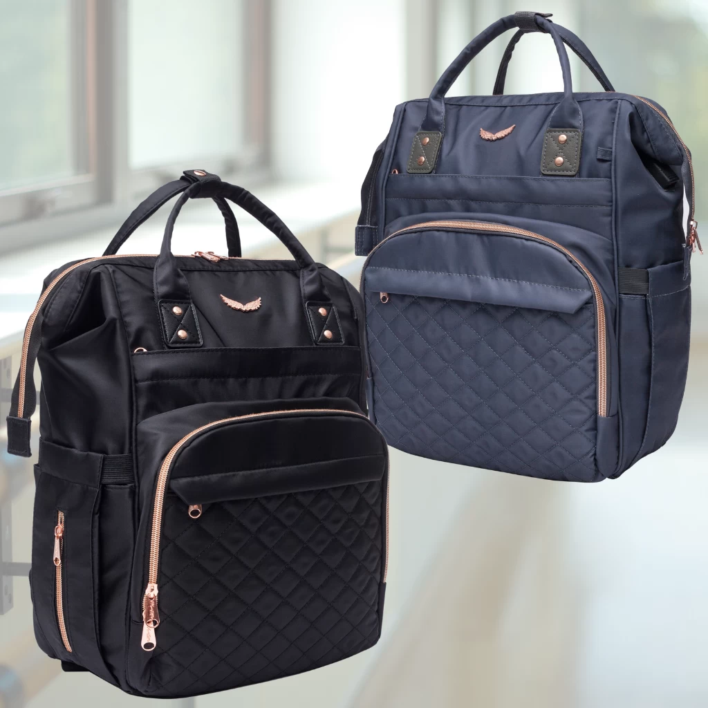 It has a streamlined and modern design and features stand out rose gold zippers. This backpack has mulitple compartments, including the spacious main compartment with wide top opening for larger items; a front zippered pocket for quick access to smaller items and internal pockets to help secure items such as notebooks, phone and personal belongings.Â
