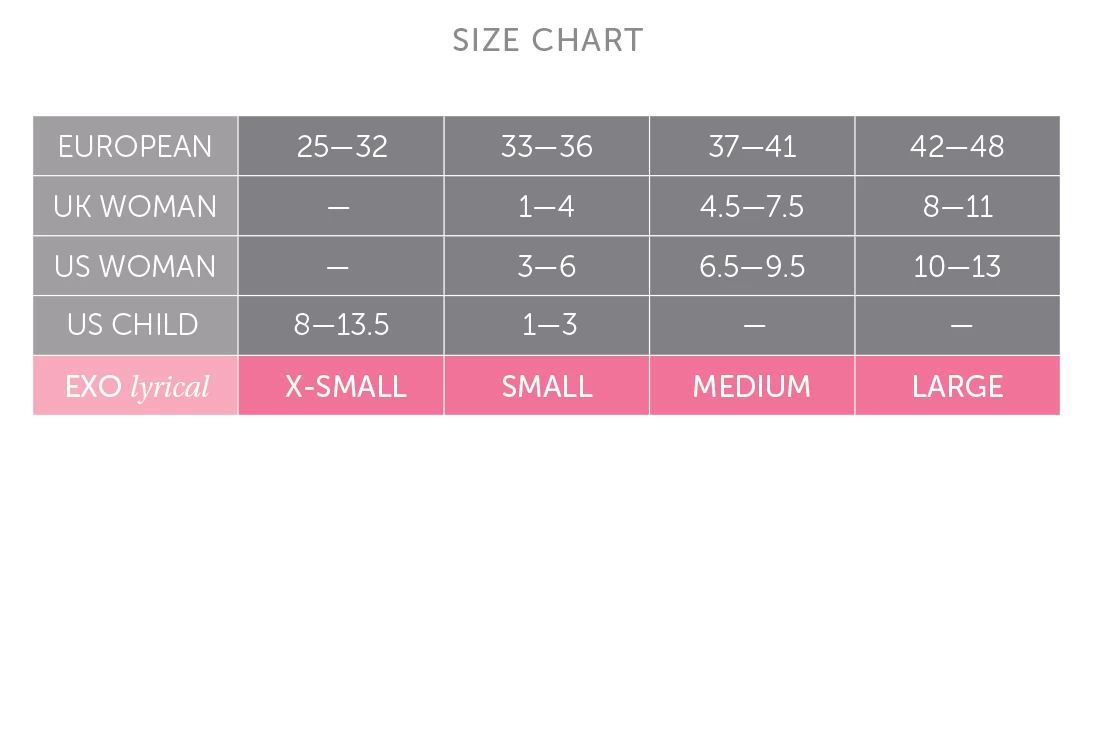 The patent applied design is constructed from a seamless medical grade compression material that helps reduce muscle tear and limit soft tissue damage. The Exo also encourages blood flow from the foot to the heart, which in turn improves oxygenation and gives the dancer more energy in the feet and legs.Â
