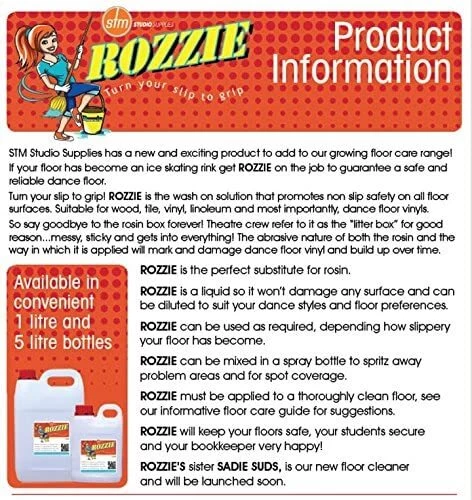 - Rozzie is a non-hazardous, biodegradable liquid that won’t damage any surface and can be diluted to suit your dance styles and floor preferences