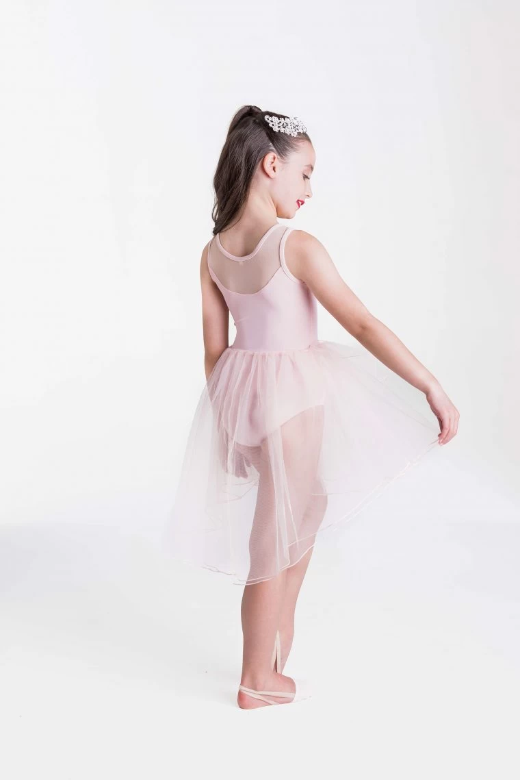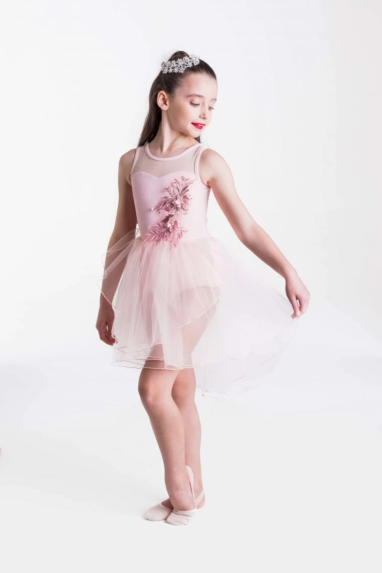 Gorgeous lyrical dress with a nylon/spandex leotard combined with flower applique and a soft tulle overlay, looks amazing on stage.