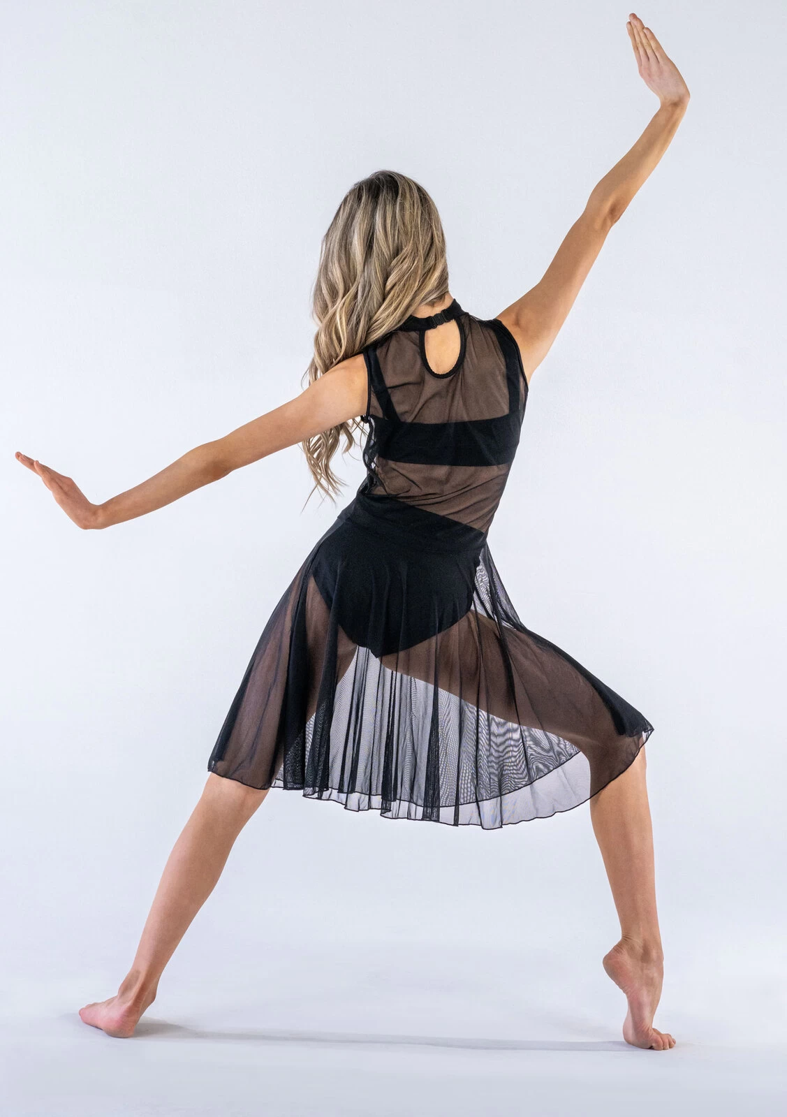 A striking design for the modern performer. The Mesh Performance Dress features a high neck line, transitioning into a gathered skirt.