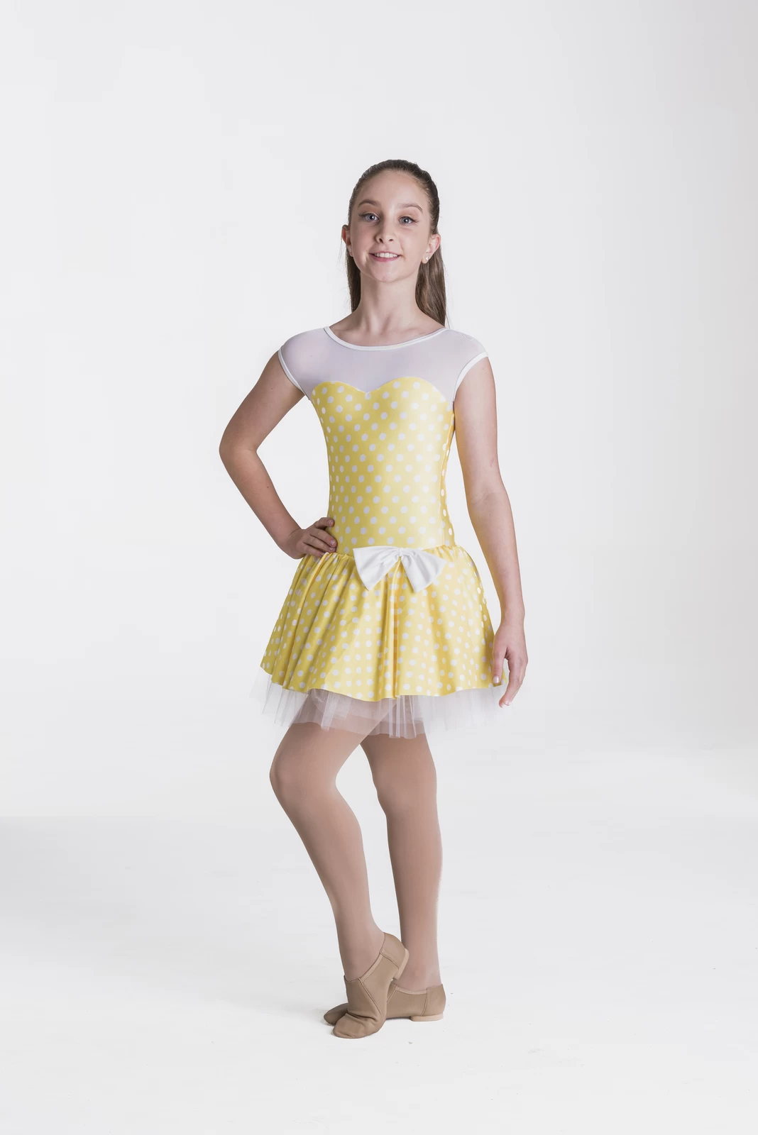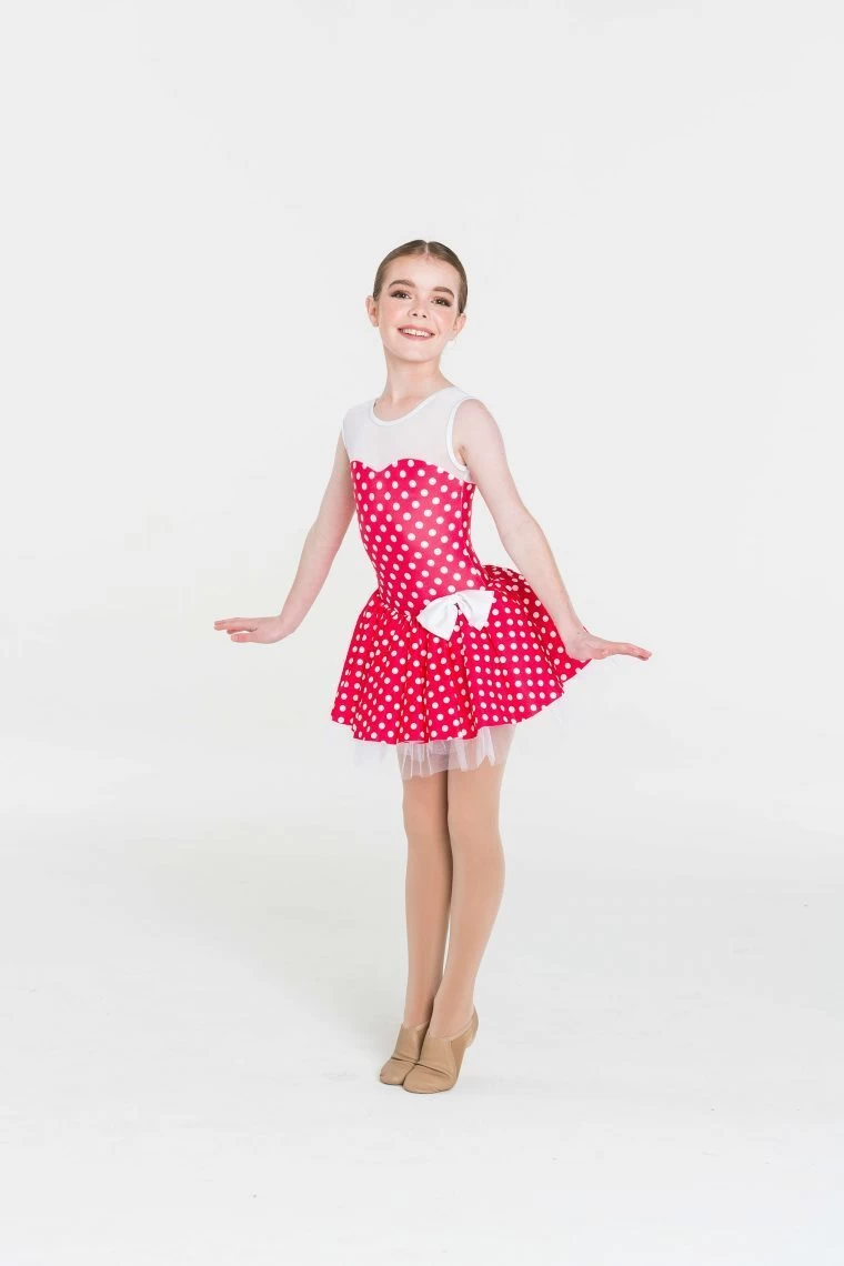 Cute polka dot print dress with tule under skirt and sweet heart neck line with mesh capped sleeves. Made from Polyester/Lycra, with mesh and tulle, this dress has white polka dots constrasting with the main colour. Navy Dress has Multi-Colour Polka dots.