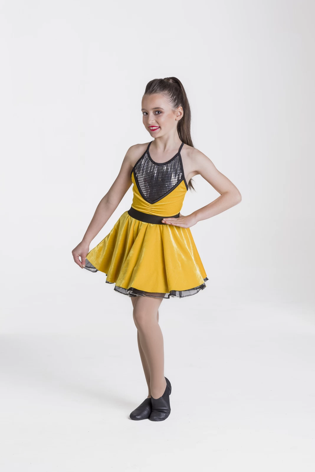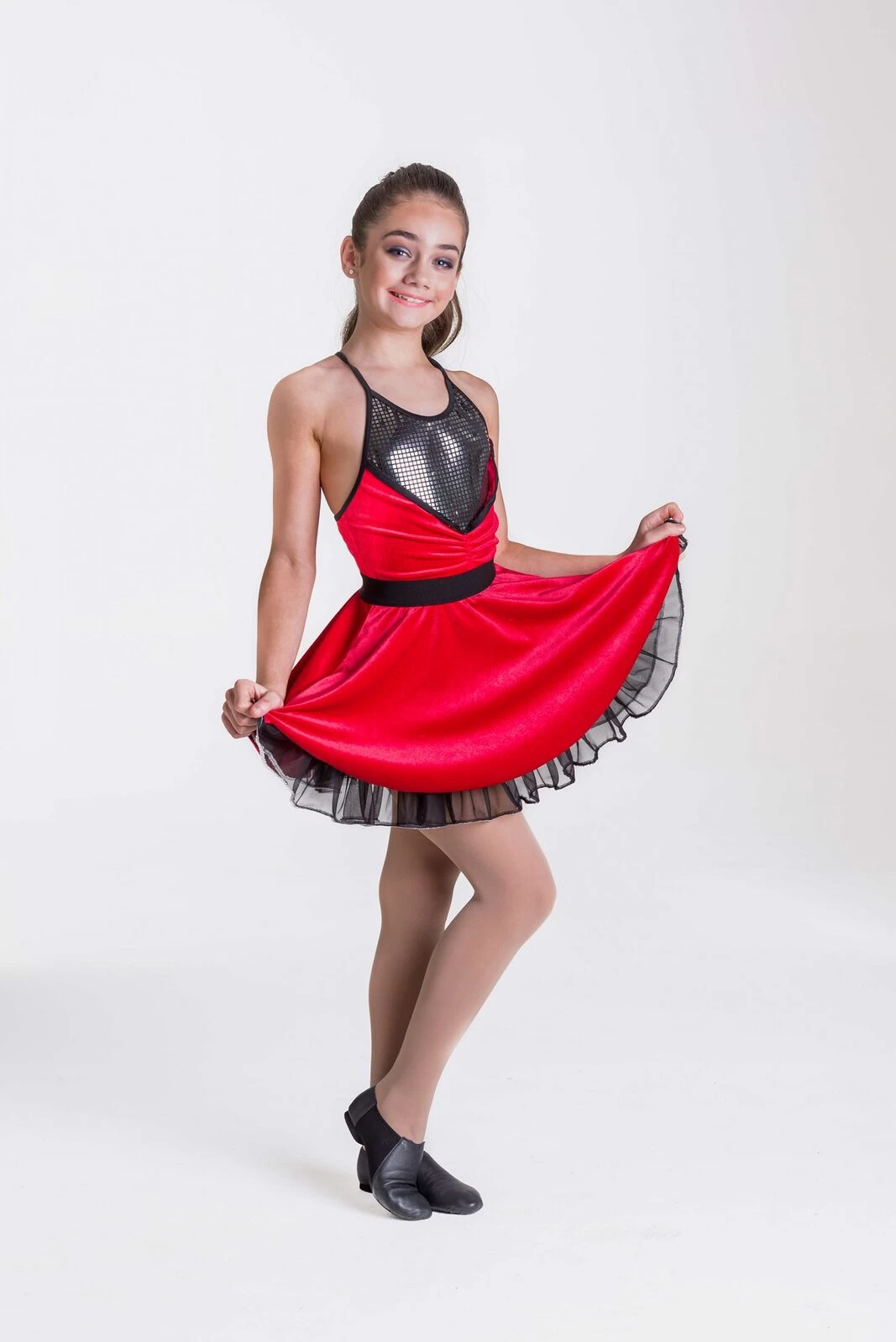 Gorgeous velvet and tule flare dress, with metalic front and criss-cross back, available in red, vintage pink & yellow.
