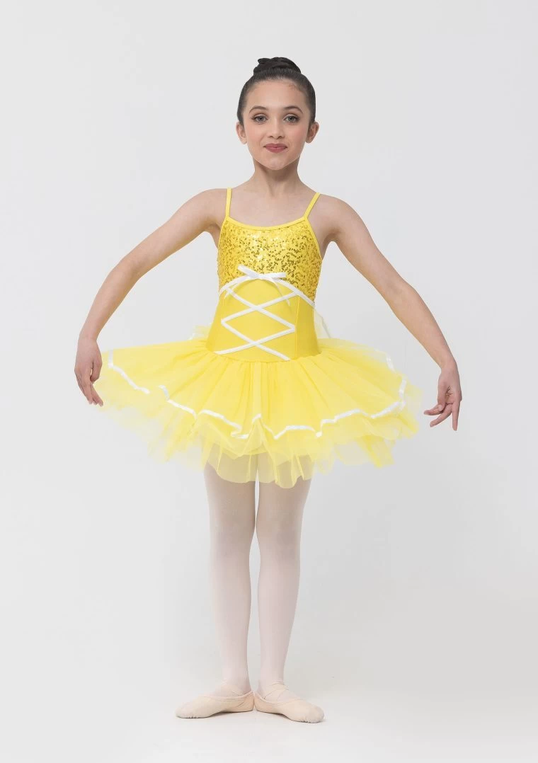 This adorable tutu dress features sequin fabric with a criss-cross bodice and four layers of tulle. It is the perfect costume for any junior classical, coming in multiple colours including Blue, Pink, Purple, and Yellow.