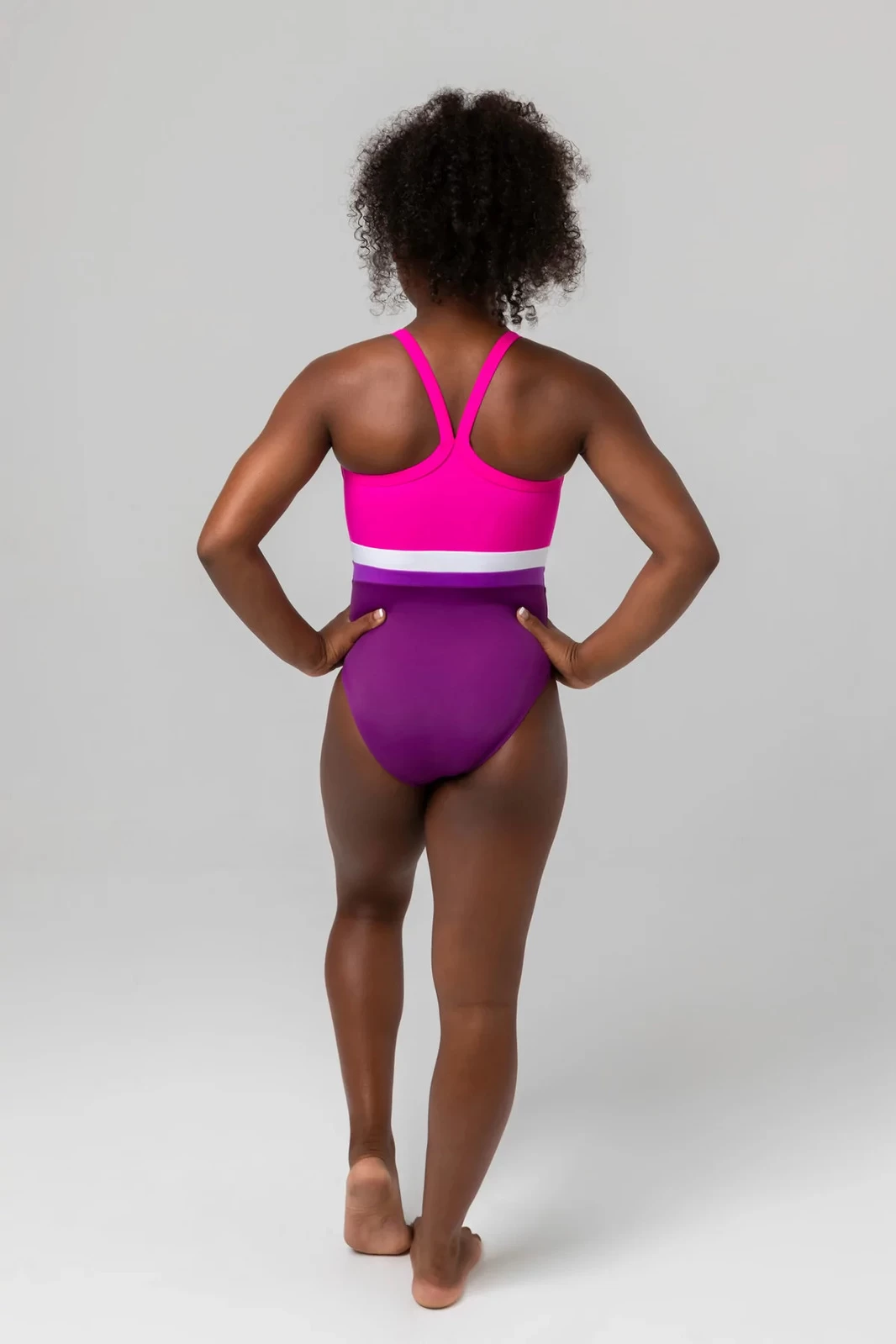 A classic Sylvia P shape reimagined in bright popping colours that sizzle. Our Classic active leotard Y-shape allows for full freedom of movement through the shoulders and arms. Styled in a V-shaped neckline with contrast colour belt panelling and stunning silver mirror sequin motif flowing up the front body. Made from our flexible matt lycra fabrication that’s quick-drying and durable, fully lined through the front with elasticated legs for comfort. Sylvia P branded sequin logo on the front leg.